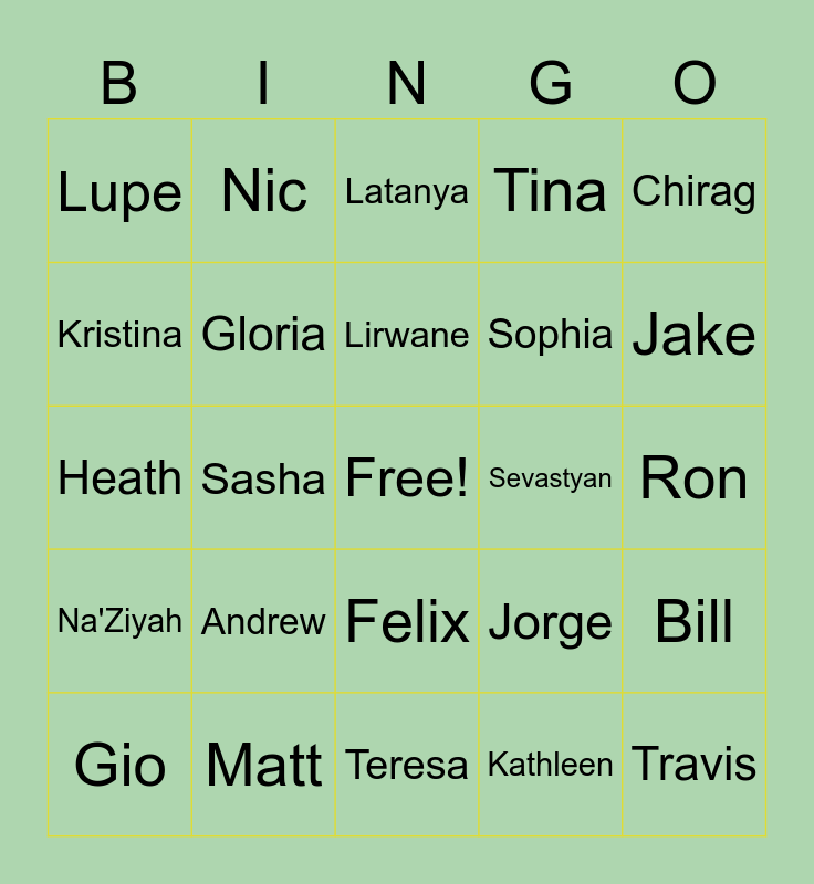 This bingo card has a free space and 24 words: Andrew, Matt, Lirwane, Gio, Chirag, Lupe, Kristina, Nic, Sevastyan, Felix, Sophia, Heath, Jorge, Bill, Gloria, Kathleen, Ron, Latanya, Jake, Sasha, Travis, Na'Ziyah, Tina and Teresa.