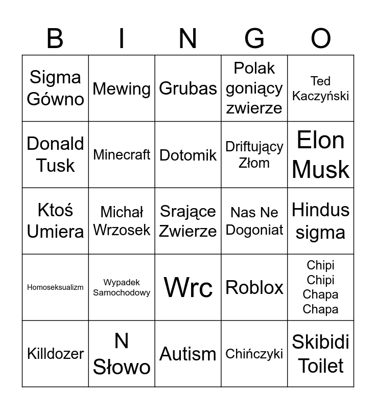 This bingo card has a free space and 24 words: Wypadek Samochodowy, N Słowo, Dotomik, Killdozer, Ted Kaczyński, Sigma Gówno, Donald Tusk, Mewing, Nas Ne Dogoniat, Wrc, Driftujący Złom, Ktoś Umiera, Roblox, Chipi Chipi Chapa Chapa, Minecraft, Chińczyki, Hindus sigma, Grubas, Elon Musk, Michał Wrzosek, Skibidi Toilet, Homoseksualizm, Polak goniący zwierze and Autism.