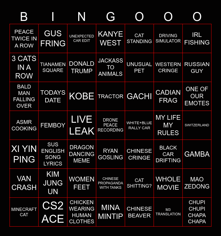 This bingo card has a free space and 48 words: CAT SHITTING?, WESTERN CRINGE, MINA MINTIP, FEMBOY, KOBE, SWITZERLAND, GUS FRING, CS2 ACE, DRIVING SIMULATOR, RYAN GOSLING, IRL FISHING, KANYE WEST, CADIAN FRAG, GACHI, VAN CRASH, MY LIFE MY RULES, 3 CATS IN A ROW, RUSSIAN GUY, WHOLE MOVIE, CAT STANDING, UNUSUAL PET, LIVE LEAK, PEACE TWICE IN A ROW, TIANAMEN SQUARE, MAO ZEDONG, DONALD TRUMP, ONE OF OUR EMOTES, MINECRAFT CAT, TRACTOR, TODAYS DATE, M3 TRANSLATION, WHITE+BLUE RALLY CAR, GAMBA, KIM JUNG UN, ASMR COOKING, CHINESE CRINGE, BLACK CAR DRIFTING, BALD MAN FALLING OVER, DRAGON DANCING MEME, WOMEN FEET, XI YIN PING, CHUPI CHUPI CHAPA CHAPA, UNEXPECTED CAR EDIT, CHICKEN WEARING HUMAN CLOTHES, JACKASS TO ANIMALS, CHINESE PROPAGANDA WITH TANKS, SUS ENGLISH SONG LYRICS and CHINESE BEAVER.