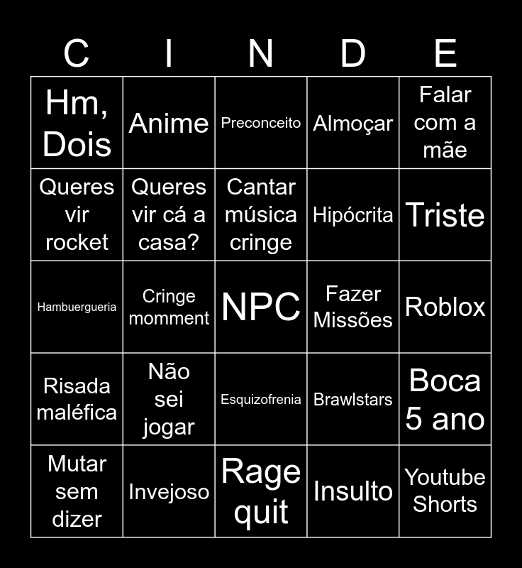 This bingo card has a free space and 24 words: Não sei jogar, Invejoso, Cantar música cringe, Mutar sem dizer, Falar com a mãe, Hm, Dois, Queres vir rocket, Anime, Fazer Missões, Esquizofrenia, Hipócrita, Hambuergueria, Brawlstars, Boca 5 ano, Queres vir cá a casa?, Insulto, Roblox, Preconceito, Triste, Cringe momment, Youtube Shorts, Risada maléfica, Almoçar and Rage quit.