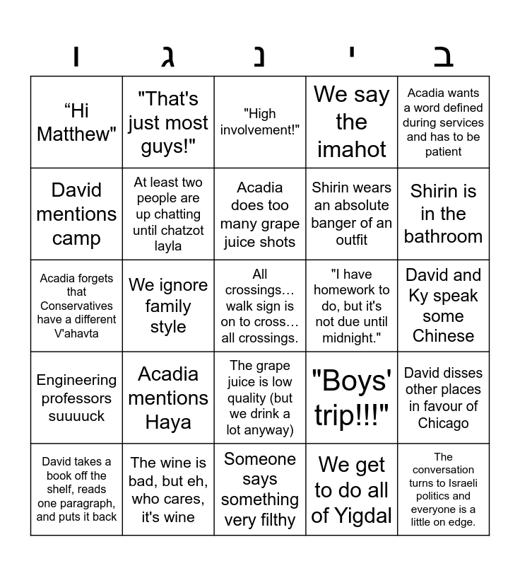 This bingo card has a free space and 39 words: "Hi David", Ky makes fun of David after handwashing, תֵּבֵל, At least two people are up chatting until chatzot layla, David takes a book off the shelf, reads one paragraph, and puts it back, The grape juice is low quality (but we drink a lot anyway), Acadia does too many grape juice shots, We mix up melodies in Kabbalat Shabbat, Acadia wants a word defined during services and has to be patient, Engineering professors suuuuck, We ignore family style, We say the imahot, The conversation turns to Israeli politics and everyone is a little on edge., David and Ky speak some Chinese, "I have homework to do, but it's not due until midnight.", Acadia mentions Haya, We sing obnoxiously loud during kiddush, “Hi Matthew", Shirin did something active at a crazy time, "Boys' trip!!!", David mentions camp, Someone says something very filthy, Shirin wears an absolute banger of an outfit, Shirin is in the bathroom, We can't look something up because it's Shabbat, "Girls' trip!!!", Acadia brings up the bingo, Someone uses their massive brain to infer that David likes linguistics, David agrees to sing "מחר הוא שייך רק לי", "That's just most guys!", David brings up Quechua, "You don't have to go home, but you can't stay here.", "High involvement!", The wine is bad, but eh, who cares, it's wine, We get to do all of Yigdal, "Go down the stairs and meet in front of the museum.", David disses other places in favour of Chicago, Acadia forgets that Conservatives have a different V'ahavta and Dancy Aleinu.