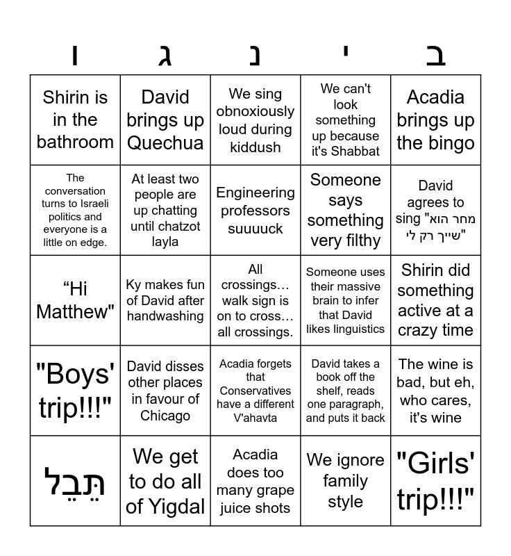 This bingo card has a free space and 39 words: "You don't have to go home, but you can't stay here.", Dancy Aleinu, "Go down the stairs and meet in front of the museum.", At least two people are up chatting until chatzot layla, תֵּבֵל, Acadia forgets that Conservatives have a different V'ahavta, Engineering professors suuuuck, Shirin wears an absolute banger of an outfit, Acadia brings up the bingo, "Boys' trip!!!", Ky makes fun of David after handwashing, We can't look something up because it's Shabbat, "Girls' trip!!!", Shirin did something active at a crazy time, Someone uses their massive brain to infer that David likes linguistics, David disses other places in favour of Chicago, We say the imahot, Shirin is in the bathroom, "I have homework to do, but it's not due until midnight.", David takes a book off the shelf, reads one paragraph, and puts it back, The conversation turns to Israeli politics and everyone is a little on edge., Acadia does too many grape juice shots, Someone says something very filthy, David agrees to sing "מחר הוא שייך רק לי", The grape juice is low quality (but we drink a lot anyway), David and Ky speak some Chinese, "That's just most guys!", "High involvement!", David mentions camp, David brings up Quechua, Acadia mentions Haya, We mix up melodies in Kabbalat Shabbat, We sing obnoxiously loud during kiddush, We get to do all of Yigdal, We ignore family style, Acadia wants a word defined during services and has to be patient, The wine is bad, but eh, who cares, it's wine, “Hi Matthew" and "Hi David".