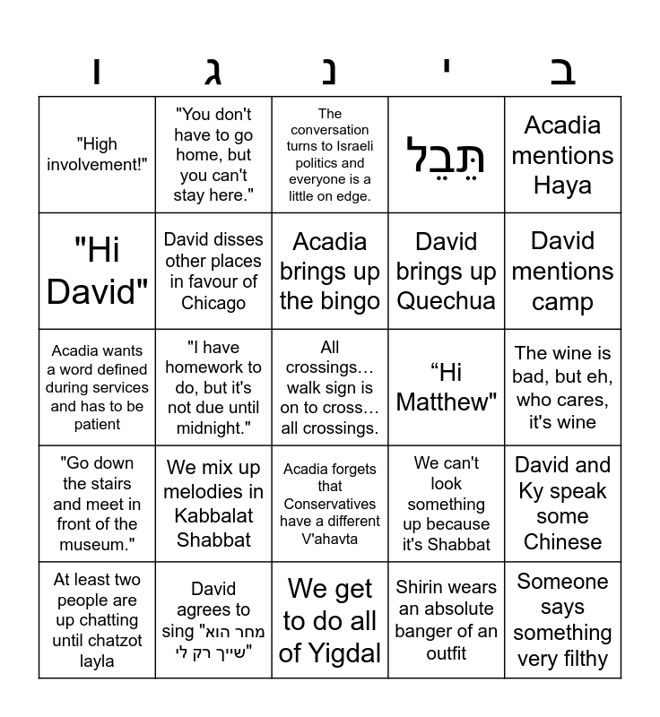 This bingo card has a free space and 39 words: Shirin is in the bathroom, "Boys' trip!!!", David takes a book off the shelf, reads one paragraph, and puts it back, David disses other places in favour of Chicago, At least two people are up chatting until chatzot layla, Acadia forgets that Conservatives have a different V'ahavta, Acadia brings up the bingo, Acadia does too many grape juice shots, Acadia mentions Haya, "Go down the stairs and meet in front of the museum.", "I have homework to do, but it's not due until midnight.", תֵּבֵל, Someone says something very filthy, The wine is bad, but eh, who cares, it's wine, “Hi Matthew", We mix up melodies in Kabbalat Shabbat, The grape juice is low quality (but we drink a lot anyway), "High involvement!", We say the imahot, We can't look something up because it's Shabbat, "Hi David", We get to do all of Yigdal, David brings up Quechua, David mentions camp, "Girls' trip!!!", Someone uses their massive brain to infer that David likes linguistics, Shirin did something active at a crazy time, Dancy Aleinu, "That's just most guys!", "You don't have to go home, but you can't stay here.", We ignore family style, We sing obnoxiously loud during kiddush, The conversation turns to Israeli politics and everyone is a little on edge., David agrees to sing "מחר הוא שייך רק לי", Shirin wears an absolute banger of an outfit, Ky makes fun of David after handwashing, David and Ky speak some Chinese, Acadia wants a word defined during services and has to be patient and Engineering professors suuuuck.