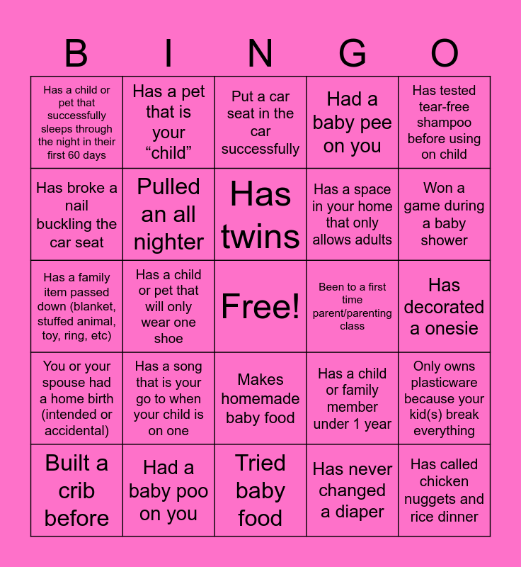 This bingo card has a free space and 28 words: Only owns plasticware because your kid(s) break everything, Has worn your shirt inside out because kids are chaos, Has a space in your home that only allows adults, Has never changed a diaper, Has broke a nail buckling the car seat, Put a car seat in the car successfully, Has a pet that is your “child”, You or your spouse had a home birth (intended or accidental), Been to a first time parent/parenting class, Built a crib before, Has a family item passed down (blanket, stuffed animal, toy, ring, etc), Had a baby pee on you, Had a baby poo on you, Tried baby food, Won a game during a baby shower, Has/had a themed nursery, Has a song that is your go to when your child is on one, Pulled an all nighter, Has twins, Makes homemade baby food, Has a child or pet that successfully sleeps through the night in their first 60 days, Will admit to bumping their kids (or anothers kiddo) head on something when carrying them to bed, Has called chicken nuggets and rice dinner, Has a child or pet that will only wear one shoe, Has decorated a onesie, Has a child or family member under 1 year, Has tested tear-free shampoo before using on child and Has broken a toy "accidentally".
