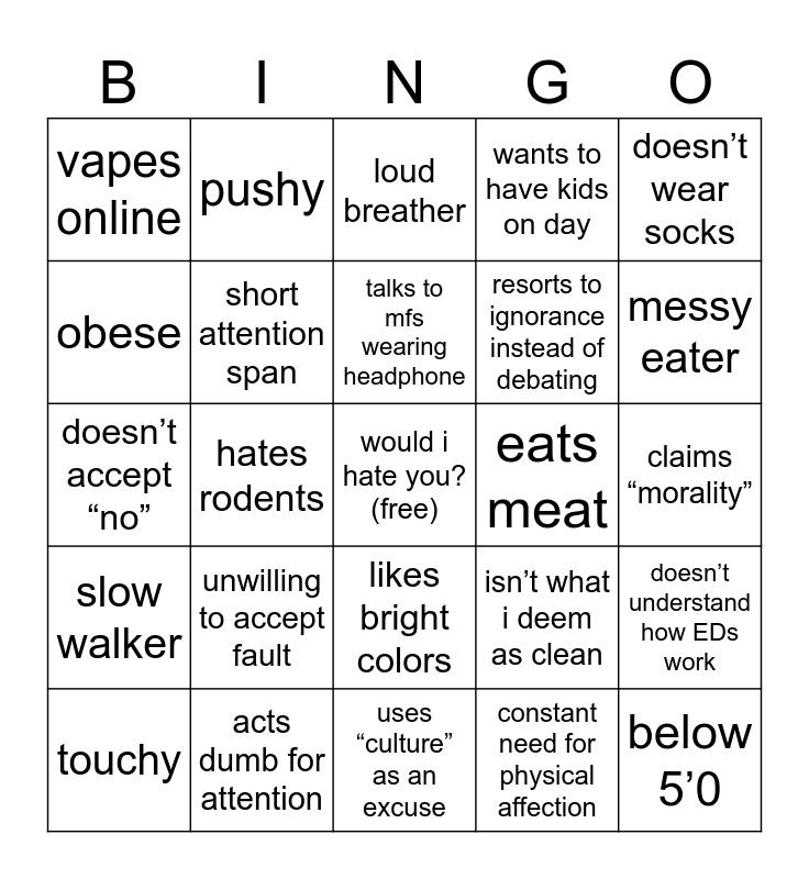 This bingo card has a free space and 24 words: unwilling to accept fault, acts dumb for attention, talks to mfs wearing headphone, touchy, doesn’t wear socks, vapes online, obese, pushy, eats meat, likes bright colors, resorts to ignorance instead of debating, doesn’t accept “no”, isn’t what i deem as clean, doesn’t understand how EDs work, short attention span, constant need for physical affection, claims “morality”, loud breather, messy eater, hates rodents, below 5’0, slow walker, wants to have kids on day and uses “culture” as an excuse.