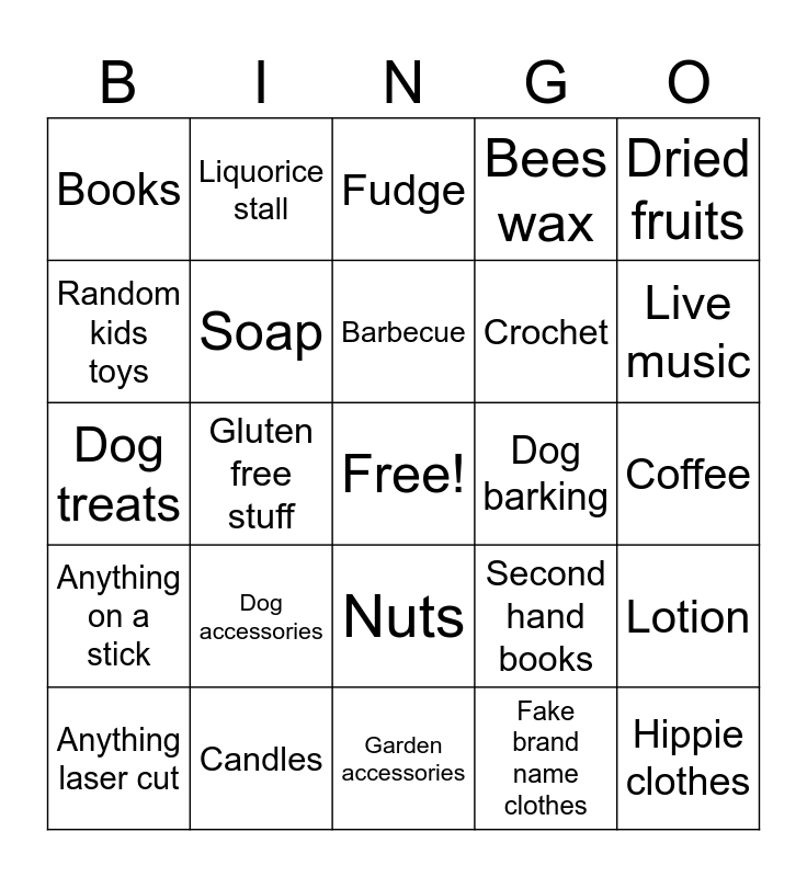 This bingo card has a free space and 25 words: Dog accessories, Garden accessories, Barbecue, Anything laser cut, Dried fruits, Books, Random kids toys, Liquorice stall, Dog barking, Nuts, Crochet, Dog treats, Second hand books, Lotion, Soap, Baked goods (with gluten), Coffee, Fudge, Live music, Gluten free stuff, Hippie clothes, Candles, Anything on a stick, Bees wax and Fake brand name clothes.