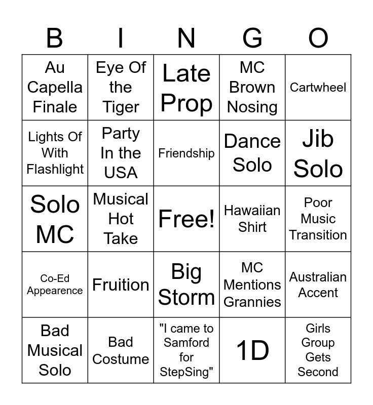 This bingo card has a free space and 25 words: Fruition, "I came to Samford for StepSing", Friendship, Bad Musical Solo, Cartwheel, Au Capella Finale, Lights Of With Flashlight, Eye Of the Tiger, Hawaiian Shirt, Big Storm, Dance Solo, Solo MC, MC Mentions Grannies, Australian Accent, Party In the USA, The Final Countdown, Poor Music Transition, Late Prop, Jib Solo, Musical Hot Take, Girls Group Gets Second, Bad Costume, Co-Ed Appearence, MC Brown Nosing and 1D.