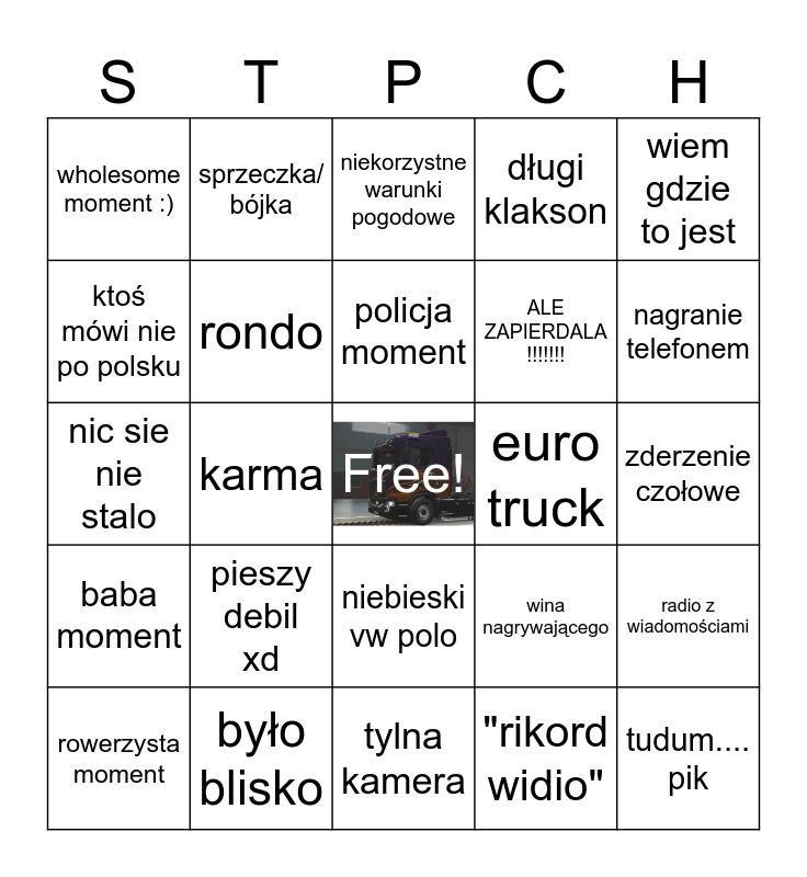 This bingo card has a free space and 32 words: "rikord widio", wymuszenie pierwszeństwa, karma, przeklinanie, baba moment, rondo, wiem gdzie to jest, radio z wiadomościami, sprzeczka/ bójka, fauna, policja moment, niekorzystne warunki pogodowe, drift, wzywanie bóstw, euro truck, taktyczny klakson, rowerzysta moment, nic sie nie stalo, niebieski vw polo, pieszy debil xd, wina nagrywającego, wyprzedzanie, zderzenie czołowe, było blisko, tudum.... pik, długi klakson, ALE ZAPIERDALA !!!!!!!, ktoś mówi nie po polsku, wholesome moment :), tylna kamera, goofy dźwięk and nagranie telefonem.