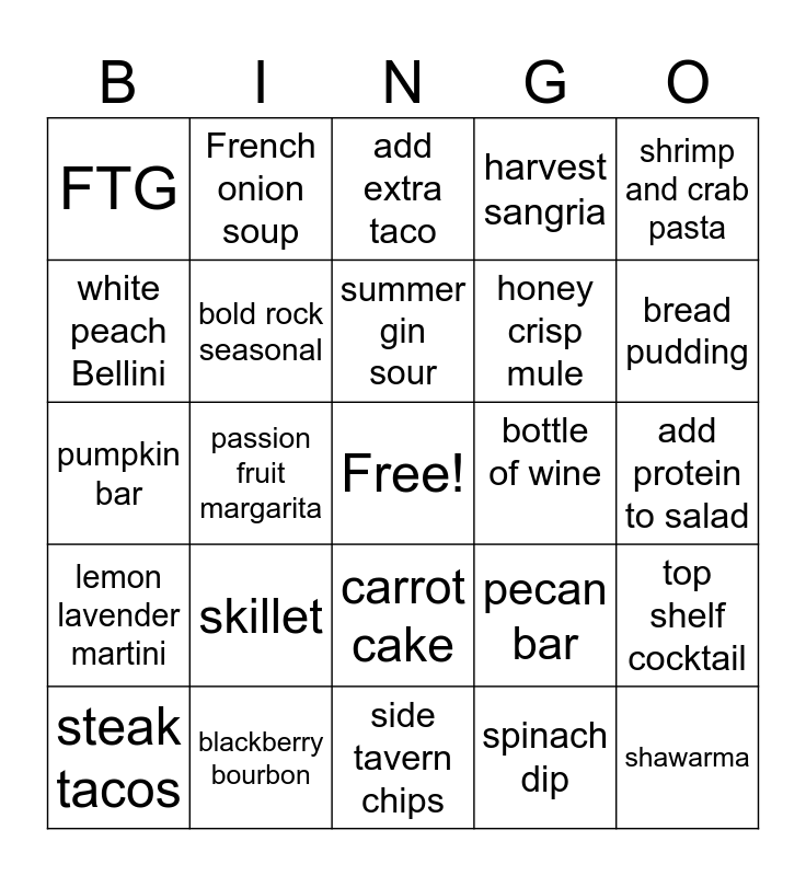 This bingo card has a free space and 24 words: skillet, blackberry bourbon, summer gin sour, steak tacos, shrimp and crab pasta, FTG, white peach Bellini, French onion soup, bottle of wine, carrot cake, honey crisp mule, pumpkin bar, pecan bar, top shelf cocktail, bold rock seasonal, spinach dip, add protein to salad, add extra taco, bread pudding, passion fruit margarita, shawarma, lemon lavender martini, harvest sangria and side tavern chips.