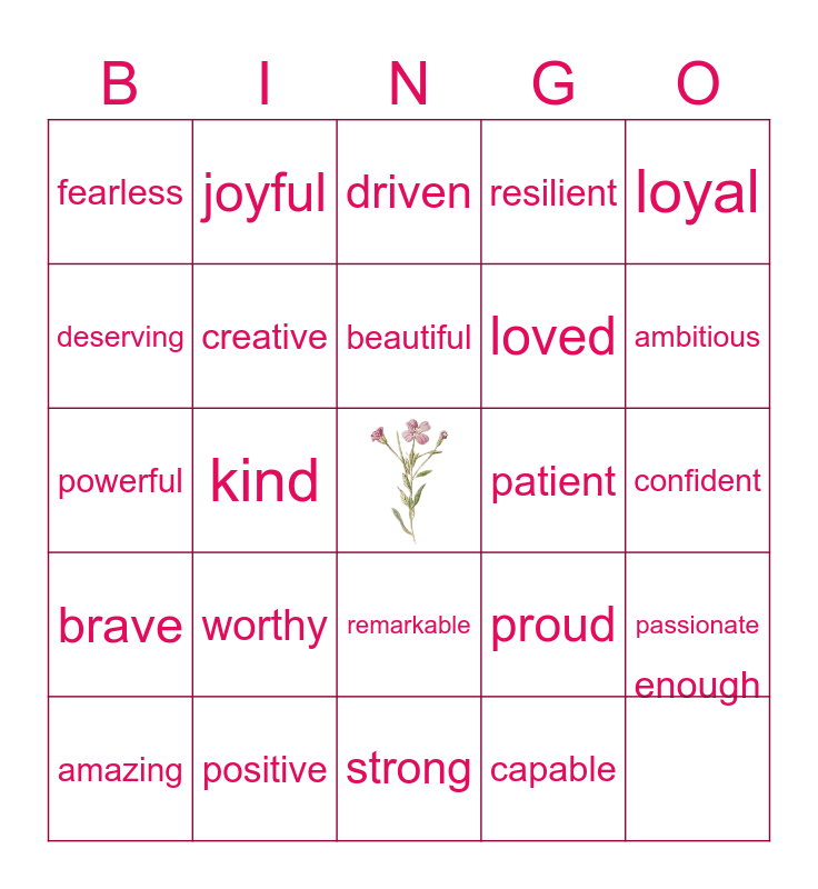 This bingo card has a free space and 24 words: worthy, positive, beautiful, amazing, loyal, fearless, deserving, joyful, patient, remarkable, loved, powerful, proud, passionate, creative, capable, confident, driven, ambitious, kind, enough, brave, resilient and strong.