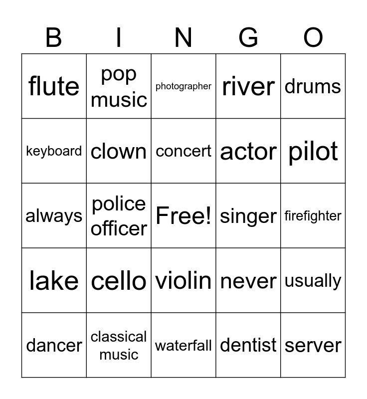 This bingo card has a free space and 24 words: cello, classical music, concert, dancer, drums, flute, keyboard, pop music, singer, violin, actor, always, never, usually, clown, dentist, firefighter, photographer, pilot, police officer, server, lake, river and waterfall.