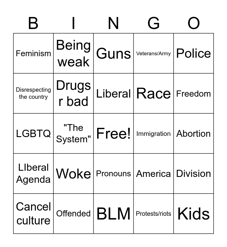 This bingo card has a free space and 24 words: Woke, Offended, Liberal, Cancel culture, Police, Feminism, Disrespecting the country, Being weak, Immigration, Pronouns, Race, LGBTQ, America, Division, Drugs r bad, Protests/riots, Abortion, Guns, Freedom, "The System", Kids, LIberal Agenda, Veterans/Army and BLM.