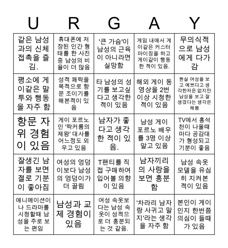 This bingo card has a free space and 24 words: 여성의 엉덩이보다 남성의 엉덩이가 더 끌림, 남성과 교제 경험이 있음, 타 남성의 성기를 보고싶다고 생각한 적이 있음, 애니메이션이나 드라마를 시청할때 남성을 주로 보는 편임, 무의식적으로 남성에게 다가감, 같은 남성과의 신체접촉을 즐김., 평소에 게이같은 말투와 행동을 자주 함, 휴대폰에 저장된 인간 형태를 한 사진중 남성의 비율이 더 많음, 남성 게이 포르노 배우를 3명 이상 알고 있음, T팬티를 직접 구매하여 입어볼 의향이 있음, 해외 게이 동영상을 2번 이상 시청한 적이 있음, 항문 자위 경험이 있음, 남자끼리의 사랑을 보면 흥분함, 남성 속옷 모델을 유심히 지켜본 적이 있음, 성적 쾌락을 목적으로 항문 조이기를 해본적이 있음, '차라리 남자랑 사귀고 말지'라는 생각을 자주 함, TV에서 홍석천이 나올때마다 공감대가 형성되고 기분이 좋음, '큰 가슴'이 남성의 근육이 아니라면 실망함, 현실 여성을 보고 예쁘다고 생각한저은 없지만 남성을 보고 잘생겼다는 생각은 해봄, 게이 포르노인 '락커룸의 제왕' 대사를 어느정도 외우고 있음, 본인이 게이인지 한번쯤 의심이 들때가 있음, 잘생긴 남자를 보면 절로 기분이 좋아짐, 게임 내에서 게이같은 커스터마이징을 하고 게이같이 행동한 적이 있음. and 여성 속옷보다는 남성 속옷이 성적으로 더 흥분되는 것 같음..
