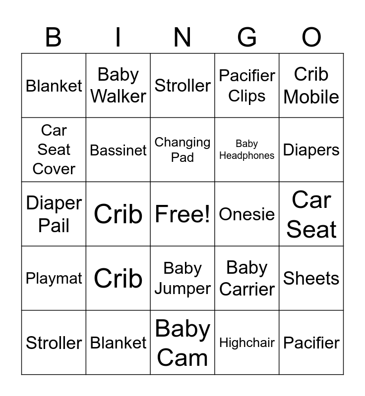 This bingo card has a free space and 29 words: Stroller, Bassinet, Crib, Onesie, Blanket, Stroller, Bassinet, Crib, Onesie, Blanket, Car Seat, Pacifier, Baby Cam, Highchair, Diapers, Mattress, Baby Jumper, Playmat, Crib Mobile, Diaper Pail, Baby Carrier, Diaper Bag, Baby Headphones, Car Seat Cover, Pacifier Clips, Baby Walker, Sheets, Changing Pad and Nail Clippers.