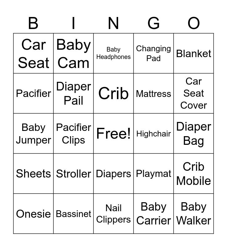 This bingo card has a free space and 24 words: Stroller, Bassinet, Crib, Onesie, Blanket, Car Seat, Pacifier, Baby Cam, Highchair, Diapers, Mattress, Baby Jumper, Playmat, Crib Mobile, Diaper Pail, Baby Carrier, Diaper Bag, Baby Headphones, Car Seat Cover, Pacifier Clips, Baby Walker, Sheets, Changing Pad and Nail Clippers.