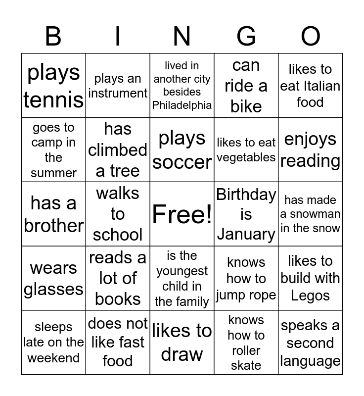 This bingo card has a free space and 24 words: reads a lot of books, does not like fast food, plays soccer, sleeps late on the weekend, likes to eat Italian food, plays tennis, goes to camp in the summer, plays an instrument, Birthday is January, is the youngest child in the family, likes to eat vegetables, has a brother, knows how to jump rope, likes to build with Legos, has climbed a tree, knows how to roller skate, has made a snowman in the snow, lived in another city besides Philadelphia, enjoys reading, walks to school, speaks a second language, wears glasses, can ride a bike and likes to draw.