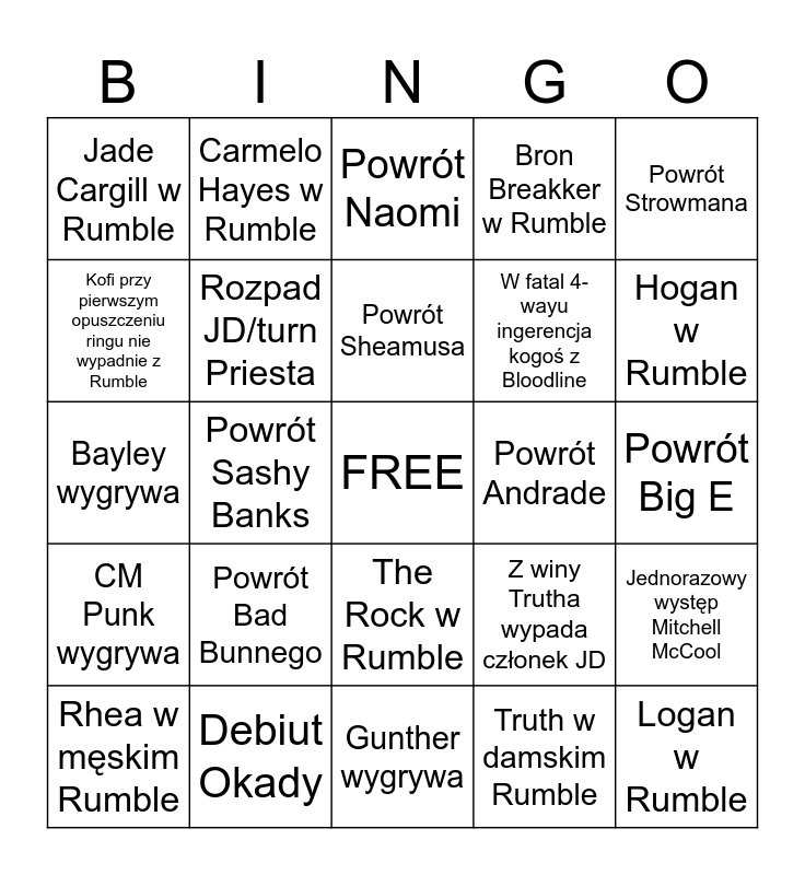 This bingo card has a free space and 24 words: Powrót Bad Bunnego, Debiut Okady, Powrót Sheamusa, Rhea w męskim Rumble, Powrót Strowmana, Jade Cargill w Rumble, Kofi przy pierwszym opuszczeniu ringu nie wypadnie z Rumble, Carmelo Hayes w Rumble, Powrót Andrade, The Rock w Rumble, W fatal 4-wayu ingerencja kogoś z Bloodline, Bayley wygrywa, Z winy Trutha wypada członek JD, Jednorazowy występ Mitchell McCool, Rozpad JD/turn Priesta, Truth w damskim Rumble, Powrót Big E, Powrót Naomi, Hogan w Rumble, Powrót Sashy Banks, Logan w Rumble, CM Punk wygrywa, Bron Breakker w Rumble and Gunther wygrywa.