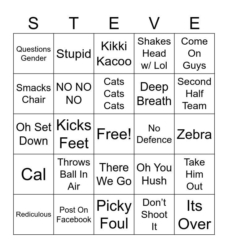 This bingo card has a free space and 32 words: Don’t Shoot It, Bites Body Part, Kicks Feet, Racial Comment, Cal, NO NO NO, Come On Guys, Take Him Out, Stupid, Go Big Blue, Cats Cats Cats, Kikki Kacoo, Ask About Remote, Covers Face, No Defence, Insults Ref, Rediculous, Oh Set Down, There We Go, Throws Ball In Air, Oh You Hush, Hair Comment, Zebra, Post On Facebook, Its Over, Shakes Head w/ Lol, Deep Breath, Smacks Chair, Questions Gender, Picky Foul, You Got To Be Kidding Me and Second Half Team.