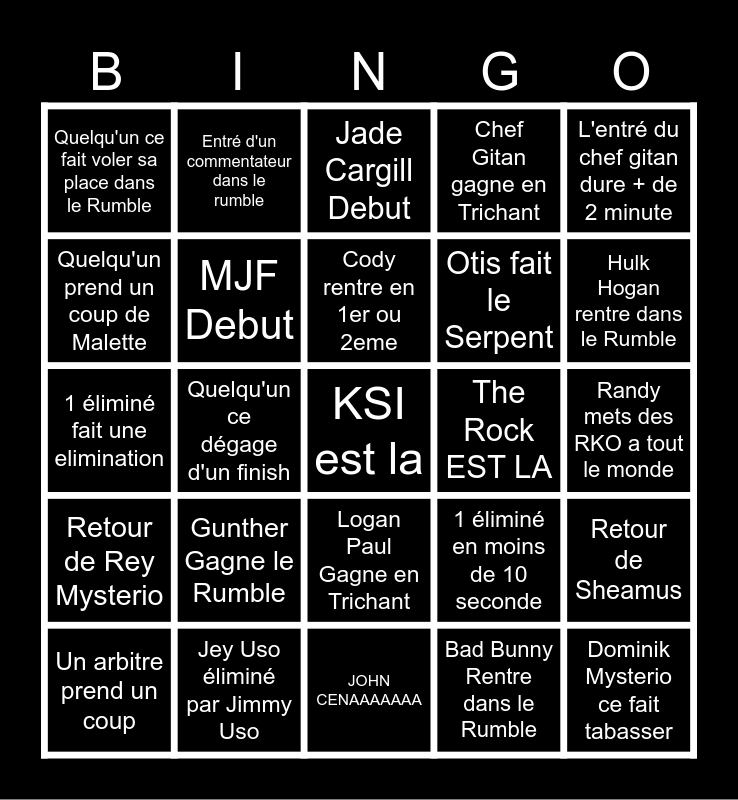 This bingo card has 25 words: Gunther Gagne le Rumble, JOHN CENAAAAAAA, Cody rentre en 1er ou 2eme, Un arbitre prend un coup, L'entré du chef gitan dure + de 2 minute, Quelqu'un ce fait voler sa place dans le Rumble, Quelqu'un prend un coup de Malette, Entré d'un commentateur dans le rumble, The Rock EST LA, Logan Paul Gagne en Trichant, Otis fait le Serpent, 1 éliminé fait une elimination, 1 éliminé en moins de 10 seconde, Retour de Sheamus, MJF Debut, Dominik Mysterio ce fait tabasser, Randy mets des RKO a tout le monde, Jade Cargill Debut, Hulk Hogan rentre dans le Rumble, Quelqu'un ce dégage d'un finish, KSI est la, Jey Uso éliminé par Jimmy Uso, Retour de Rey Mysterio, Chef Gitan gagne en Trichant and Bad Bunny Rentre dans le Rumble.