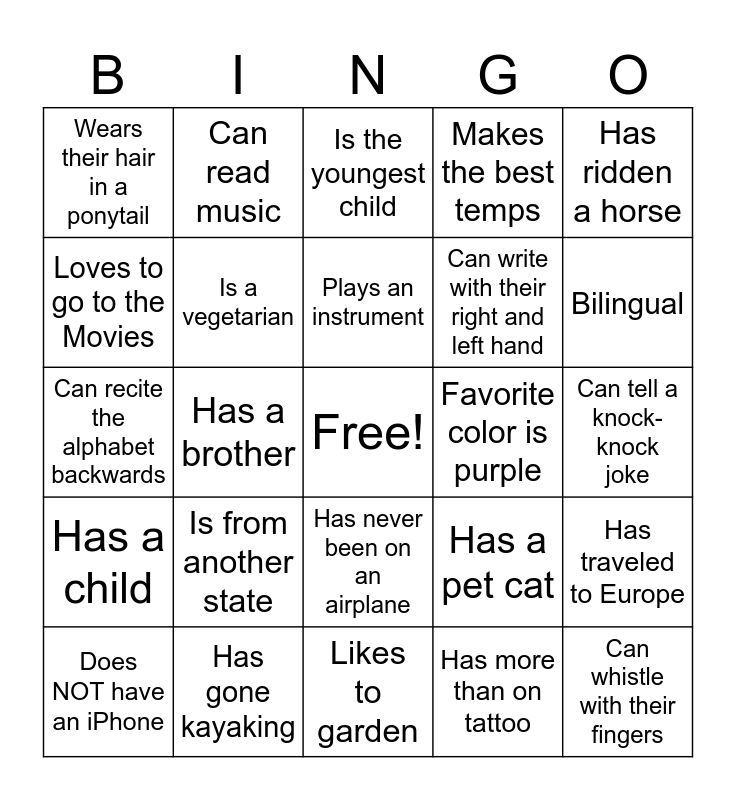 This bingo card has a free space and 32 words: Has more than on tattoo, Is on a sports team, Has a brother, Likes waking up early, Has a child, Is a vegetarian, Has ridden a horse, Has traveled to Europe, Can read music, Loves breakfast for dinner, Plays an instrument, Is the youngest child, Has Hulu, Has gotten a speeding ticket, Favorite color is purple, Has had stitches, Does NOT have an iPhone, Can recite the alphabet backwards, Has never been on an airplane, Is from another state, Has a pet cat, Has a food allergy, Can tell a knock-knock joke, Has gone kayaking, Can whistle with their fingers, Makes the best temps, Can write with their right and left hand, Loves to go to the Movies, Wears their hair in a ponytail, Likes to garden, Has broken a bone and Bilingual.