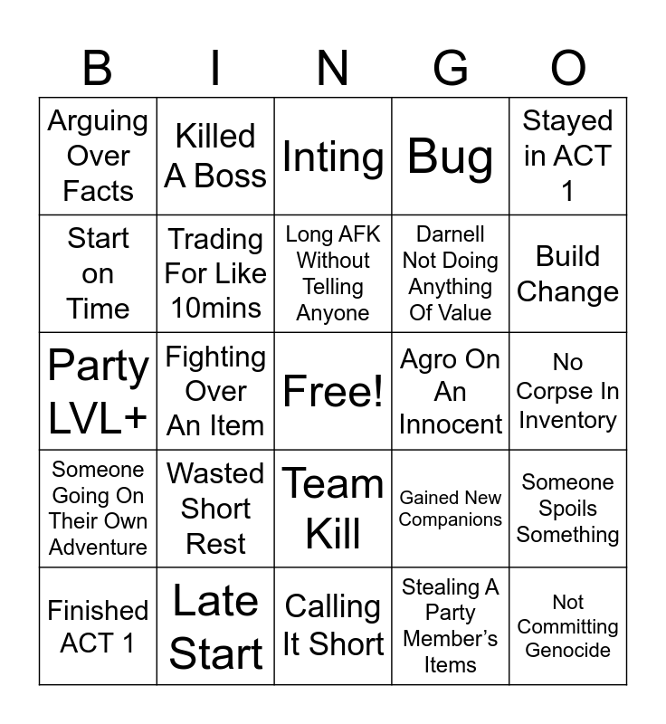 This bingo card has a free space and 24 words: Wasted Short Rest, Late Start, Long AFK Without Telling Anyone, Finished ACT 1, Stayed in ACT 1, Arguing Over Facts, Start on Time, Killed A Boss, Agro On An Innocent, Team Kill, Darnell Not Doing Anything Of Value, Party LVL+, Gained New Companions, Someone Spoils Something, Trading For Like 10mins, Stealing A Party Member’s Items, No Corpse In Inventory, Inting, Build Change, Fighting Over An Item, Not Committing Genocide, Someone Going On Their Own Adventure, Bug and Calling It Short.