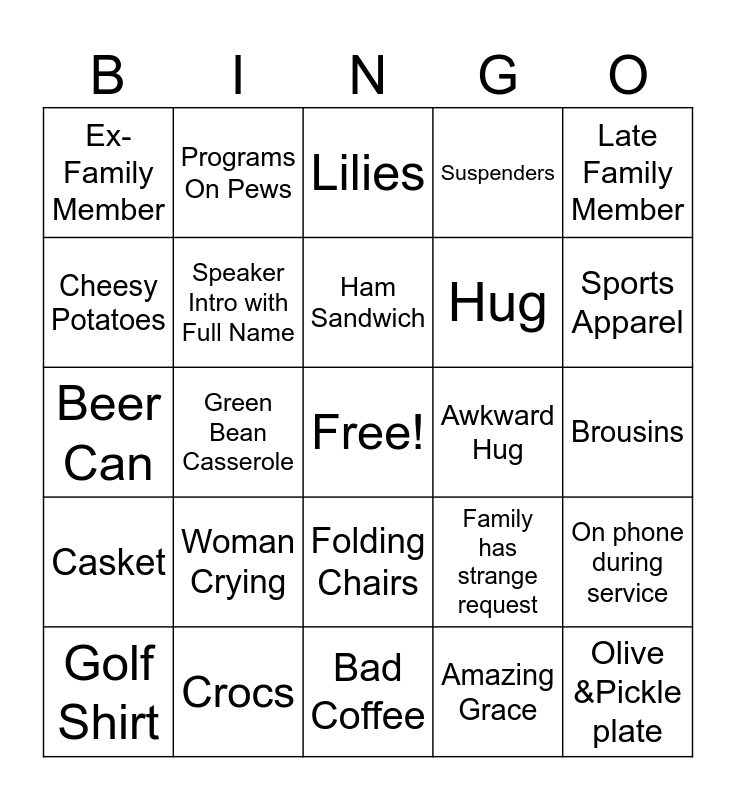 This bingo card has a free space and 24 words: Golf Shirt, Woman Crying, Ham Sandwich, Amazing Grace, Late Family Member, Ex-Family Member, Programs On Pews, Lilies, Awkward Hug, Brousins, Beer Can, Speaker Intro with Full Name, Family has strange request, On phone during service, Cheesy Potatoes, Crocs, Bad Coffee, Suspenders, Sports Apparel, Casket, Green Bean Casserole, Folding Chairs, Hug and Olive &Pickle plate.
