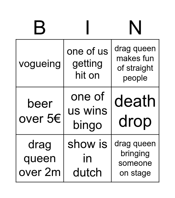 This bingo card has 12 words: drag queen dragging someone, drag queen bringing someone on stage, one of us wins bingo, death drop, one of us getting hit on, drag queen makes fun of straight people, show is in dutch, starting beef in the show, vogueing, beer over 5€, drag queen over 2m and someone being super drunk.