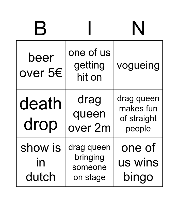 This bingo card has 12 words: drag queen dragging someone, drag queen bringing someone on stage, one of us wins bingo, death drop, one of us getting hit on, drag queen makes fun of straight people, show is in dutch, starting beef in the show, vogueing, beer over 5€, drag queen over 2m and someone being super drunk.