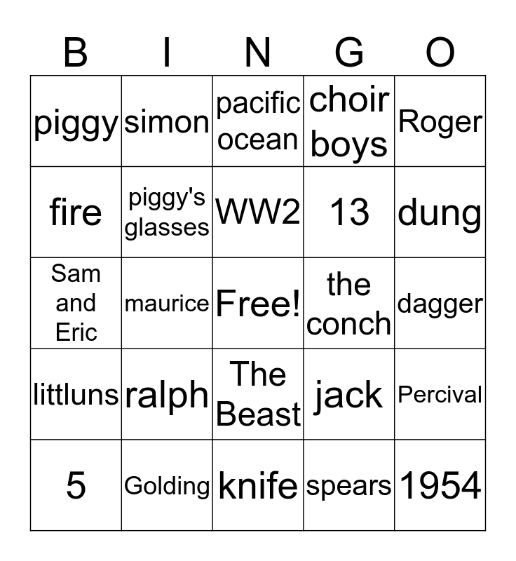This bingo card has a free space and 24 words: ralph, Golding, WW2, 5, Roger, piggy, fire, simon, the conch, The Beast, 13, Sam and Eric, jack, Percival, piggy's glasses, spears, dagger, pacific ocean, dung, maurice, 1954, littluns, choir boys and knife.