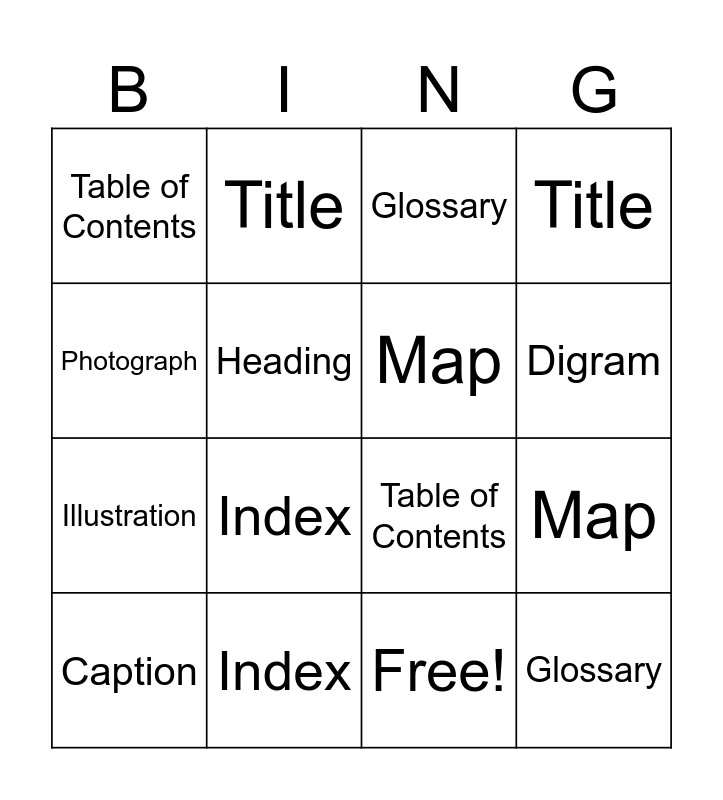 This bingo card has 16 words: Index, Map, Glossary, Table of Contents, Illustration, Title, Table of Contents, Free!, Photograph, Heading, Caption, Title, Index, Digram, Map and Glossary.