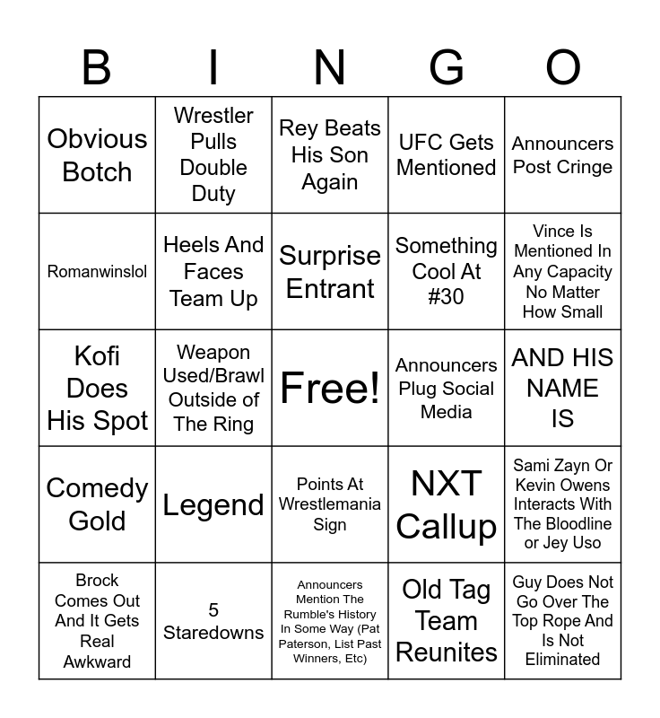 This bingo card has a free space and 24 words: Legend, 5 Staredowns, Surprise Entrant, Brock Comes Out And It Gets Real Awkward, Announcers Post Cringe, Obvious Botch, Romanwinslol, Wrestler Pulls Double Duty, Announcers Plug Social Media, Points At Wrestlemania Sign, Something Cool At #30, Kofi Does His Spot, NXT Callup, Sami Zayn Or Kevin Owens Interacts With The Bloodline or Jey Uso, Heels And Faces Team Up, Old Tag Team Reunites, AND HIS NAME IS, Rey Beats His Son Again, Vince Is Mentioned In Any Capacity No Matter How Small, Weapon Used/Brawl Outside of The Ring, Guy Does Not Go Over The Top Rope And Is Not Eliminated, Comedy Gold, UFC Gets Mentioned and Announcers Mention The Rumble's History In Some Way (Pat Paterson, List Past Winners, Etc).