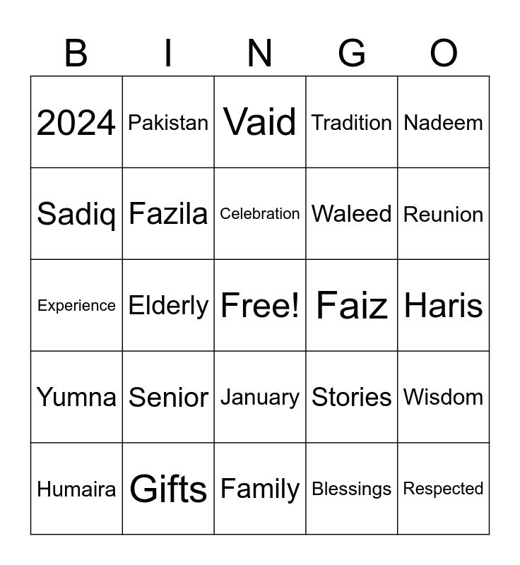 This bingo card has a free space and 99 words: Nana, Dada, Abba, Vaid, Kotwal, Vawda, Jalal, Dawood, 95, Paan, Lungi, Banyan, Headphones, January, 1929, 2024, Pakistan, India, Canada, Oman, Surat, Muskat, Jummah, Korma, Biryani, Wisdom, Celebration, Cake, Laughter, Memories, Family, Blessings, Vintage, Grandchildren, Elderly, Experience, Gratitude, Old-fashioned, Photos, Senior, Legacy, Reunion, Tradition, Gifts, Great-grandchildren, Timeless, Milestone, Joyful, Nostalgia, Heartwarming, Honour, Respected, Stories, Adventure, Living history, Cherished, Quran, Masjid, Makkah, Mithai, Chai, Faheem 1, Yasmeen, Emaan, Sufyaan, Nadeem, Assia, Khaleel, Zaina, Yumna, Zahra, Waleed, Sadiq, Sumra, Shoaib, Zulekha, Fazila, Faheem 2, Hafsah, Fatimah, Faiz, Ambrin, Ruqaiyyah, Dawood Jr., Madiha, Hamza, Amin, Maryam, Haris, Humaira, Mubin, Farrukh, Abubaker, Nasreen, Farida, Casper, Saya, Hasina and Nelofir.
