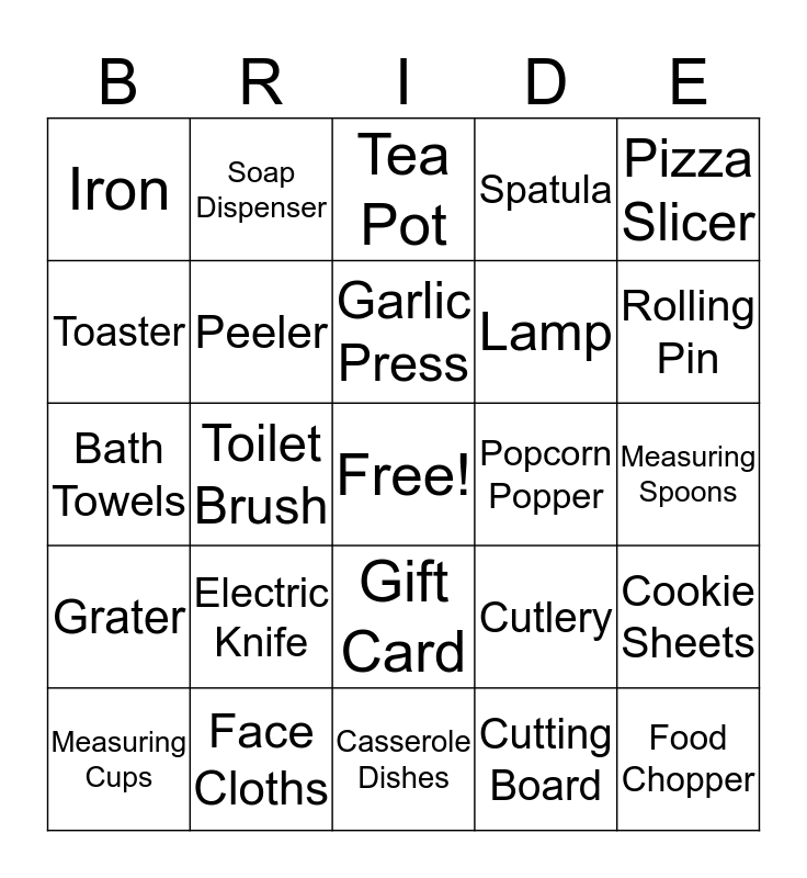 This bingo card has a free space and 24 words: Electric Knife, Face Cloths, Garlic Press, Measuring Cups, Pizza Slicer, Iron, Toaster, Soap Dispenser, Popcorn Popper, Gift Card, Lamp, Bath Towels, Cutlery, Cookie Sheets, Peeler, Cutting Board, Measuring Spoons, Tea Pot, Rolling Pin, Toilet Brush, Food Chopper, Grater, Spatula and Casserole Dishes.