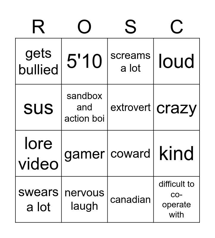 This bingo card has 16 words: nervous laugh, kind, screams a lot, gets bullied, lore video, 5'10, coward, canadian, sus, sandbox and action boi, swears a lot, loud, gamer, crazy, extrovert and difficult to co-operate with.