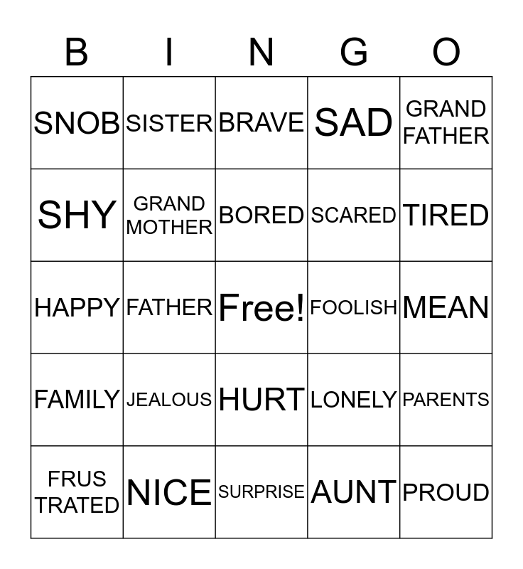 This bingo card has a free space and 32 words: AUNT, UNCLE, FATHER, MOTHER, FAMILY, GRAND MOTHER, GRAND FATHER, PARENTS, SISTER, BROTHER, BORED, BRAVE, EMB ARRASSED, EXCITED, FOOLISH, FRIENDLY, FRUS TRATED, HAPPY, HURT, JEALOUS, LONELY, MAD, MEAN, NICE, PROUD, SAD, SCARED, SHY, SNOB, SURPRISE, THIRSTY and TIRED.