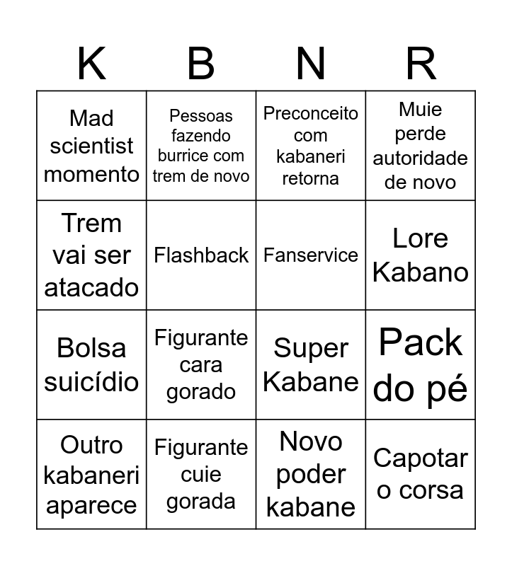 This bingo card has 16 words: Figurante cuie gorada, Pack do pé, Preconceito com kabaneri retorna, Mad scientist momento, Bolsa suicídio, Pessoas fazendo burrice com trem de novo, Super Kabane, Novo poder kabane, Trem vai ser atacado, Flashback, Outro kabaneri aparece, Muie perde autoridade de novo, Figurante cara gorado, Lore Kabano, Fanservice and Capotar o corsa.