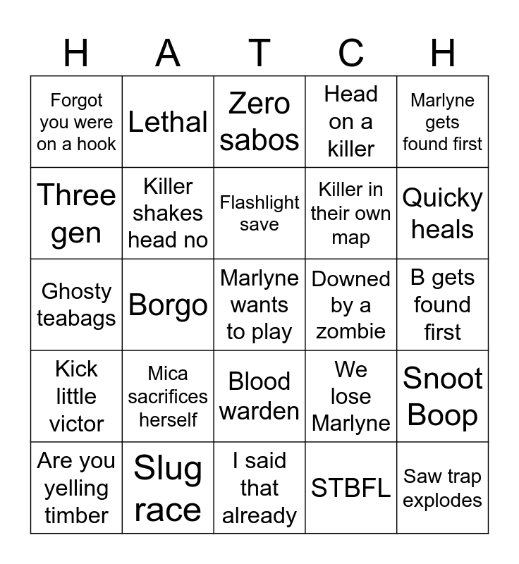 This bingo card has a free space and 64 words: Mica can't remember the name of a perk, B says you should all have calm spirit, C gets found first, Snoot Boop, NOED, No way out, Lethal, 4 escape, Flashlight save, Bear trapper, Blood warden, Mica gets found first, B gets found first, Marlyne gets found first, Mica says this three gen is really bad, Three gen, Borgo, Forgot you were on a hook, B gremlin laugh, Killer in their own map, Mica sacrifices herself, Kick little victor, Head on a killer, Failed flashlight save, Miss a brand new part, Succesful blast mine, NOED but we did all the totems, Tombstone Myers, Scratched mirror Myers, Somebody screams IRL, Mica you're running at me, One of us gets blinded, B tells C to stop clicking at them, He missed he sucks, Quicky heals, Are you yelling timber, 🎶🎶 Where are you, STBFL, Killer has icky cosmetic, Killer shakes head no, Ghosty teabags, Downed by a zombie, Corn but by accident, Caitlin forgets to take off the map, Mica forgets to take off the map, Saw trap explodes, Slug race, Pallet save, We lose Marlyne, Two different map offerings, Slippy bitchy, BBQ, I said that already, Kobe, Theo needs to pee RIGHT NOW, Killer DCs, Zero sabos, Downed during sabo, Quiche blobby white thing, Pentimento, Get Mori'd, BABE, 🎶🎶 I'm blind but I'm quiet and Same killer 3 times.