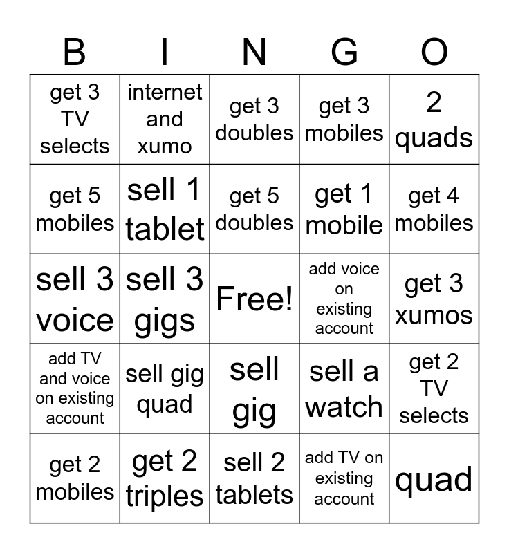 This bingo card has a free space and 24 words: sell gig quad, get 2 triples, get 5 doubles, get 2 mobiles, 2 quads, get 3 TV selects, get 5 mobiles, internet and xumo, add voice on existing account, sell gig, get 1 mobile, sell 3 voice, sell a watch, get 2 TV selects, sell 1 tablet, add TV on existing account, get 3 xumos, get 3 doubles, get 4 mobiles, sell 3 gigs, quad, add TV and voice on existing account, get 3 mobiles and sell 2 tablets.