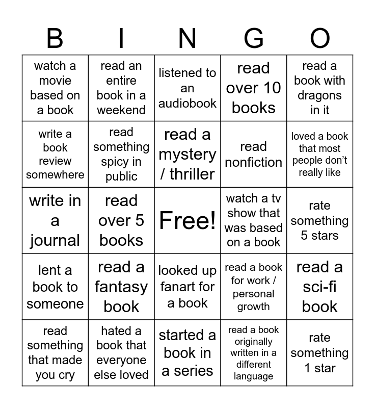 This bingo card has a free space and 38 words: switch from a book to kindle midway, switch from a kindle to audio midway, switch from a book to audio midway, read something spicy in public, read a sci-fi book, read a fantasy book, read a mystery / thriller, read a classic, read a book with dragons in it, read nonfiction, read over 5 books, read over 10 books, rate something 1 star, rate something 5 stars, write a book review somewhere, lent a book to someone, borrowed from libby or library, listened to an audiobook, re-read a book, watch a tv show that was based on a book, watch a movie based on a book, hated a book that everyone else loved, loved a book that most people don’t really like, read something that made you cry, cooked from a cookBOOK, started a book in a series, finished the last book in a series, tried a new genre, fell asleep while reading a book, stopped reading a book you didn’t like, bought a book from a bookstore, looked up fanart for a book, read a book originally written in a different language, read an entire book in a weekend, rearranged a bookshelf, read a book for work / personal growth, write in a journal and participate in a reading challenge.