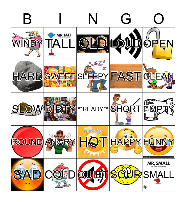 This bingo card has 24 images, a free space and 24 words: ANGRY, COLD, SLEEPY, SAD, OPEN, WINDY, HARD, TALL, SHORT, HOT, FAST, SLOW, HAPPY, FUNNY, SWEET, SOUR, EMPTY, OLD, CLEAN, DIRTY, SMALL, ROUND, LOUD and QUIET.