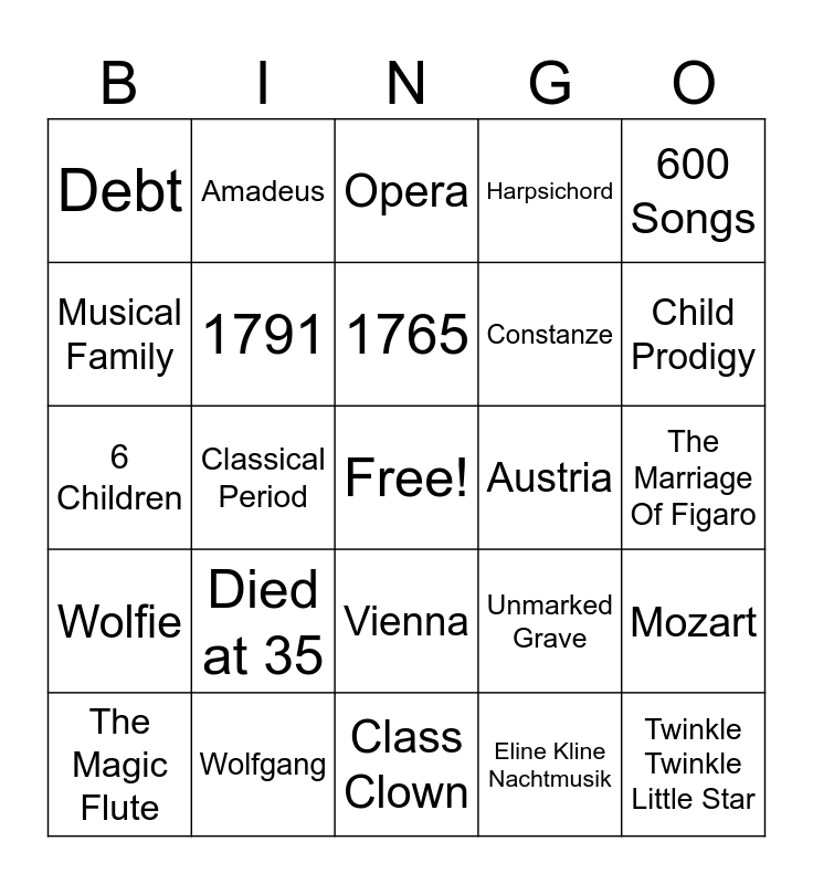 This bingo card has a free space and 24 words: Died at 35, Wolfgang, 1765, The Magic Flute, 600 Songs, Debt, Musical Family, Amadeus, Austria, Vienna, Constanze, 6 Children, Unmarked Grave, Mozart, 1791, Eline Kline Nachtmusik, The Marriage Of Figaro, Opera, Child Prodigy, Classical Period, Twinkle Twinkle Little Star, Wolfie, Harpsichord and Class Clown.