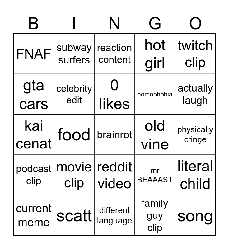 This bingo card has a free space and 42 words: tik tok ripoff, 0 likes, minecraft parkour, movie clip, family guy clip, literal child, song, meme comp, reaction content, reddit video, physically cringe, actually laugh, food, twitch clip, weird animation, mr BEAAAST, cats, kai cenat, racism, subway surfers, gta cars, cringe skit, makes me wonder whats wrong with my life, FNAF, ludwig, loops, homophobia, other animal, thirst trap, sigma male stuff, omegle, podcast clip, celebrity edit, different language, dated meme, current meme, scatt, old vine, mentions "POV", follow for part 2, hot girl and wholesome.