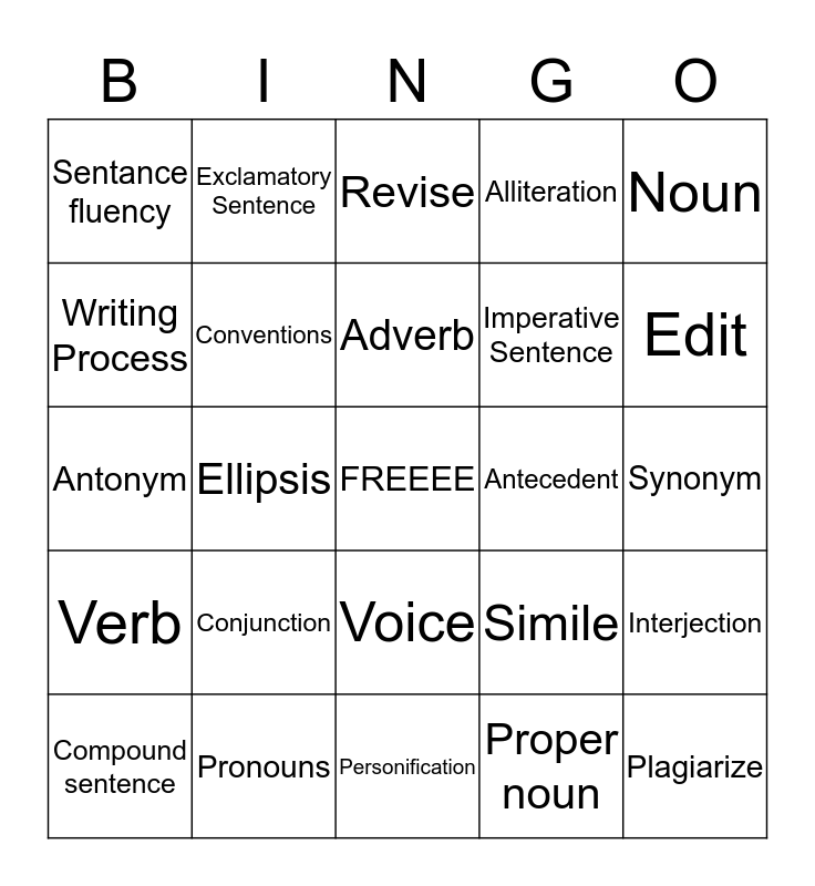 This bingo card has a free space and 24 words: Conjunction, Pronouns, Adverb, Compound sentence, Noun, Sentance fluency, Writing Process, Exclamatory Sentence, Antecedent, Voice, Imperative Sentence, Antonym, Simile, Interjection, Conventions, Proper noun, Synonym, Revise, Edit, Ellipsis, Plagiarize, Verb, Alliteration and Personification.