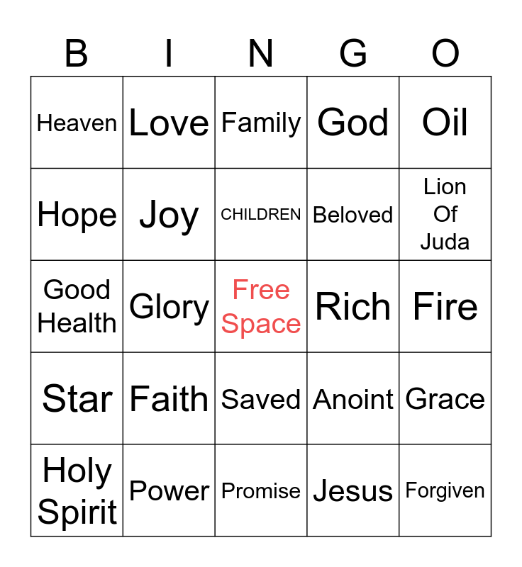This bingo card has a free space and 24 words: Faith, Power, CHILDREN, Holy Spirit, Oil, Heaven, Hope, Love, Rich, Saved, Beloved, Good Health, Anoint, Grace, Joy, Jesus, Fire, Family, Lion Of Juda, Glory, Forgiven, Star, God and Promise.