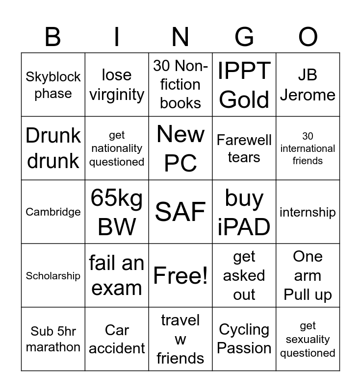 This bingo card has 26 words: Free!, Cycling Passion, New PC, Car accident, JB Jerome, Skyblock phase, Drunk drunk, lose virginity, internship, get asked out, Farewell tears, Cambridge, One arm Pull up, Sub 5hr marathon, 65kg BW, girlfriend, IPPT Gold, Scholarship, 30 Non-fiction books, SAF, 30 international friends, travel w friends, buy iPAD, fail an exam, get nationality questioned and get sexuality questioned.
