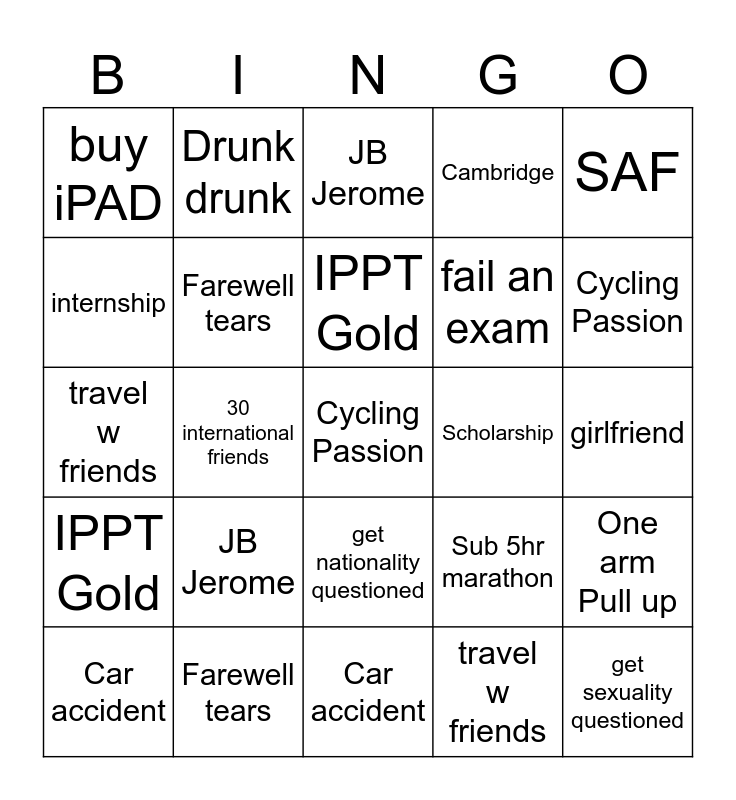 ⚠ This card has duplicate items: Cycling Passion (2), New PC (2), Car accident (2), JB Jerome (2), Skyblock phase (2), Drunk drunk (2), lose virginity (2), internship (2), get asked out (2), Farewell tears (2), Cambridge (2), One arm Pull up (2), Sub 5hr marathon (2), 65kg BW (2), girlfriend (2), IPPT Gold (2), Scholarship (2), 30 Non-fiction books (2), SAF (2), 30 international friends (2), travel w friends (2), buy iPAD (2), fail an exam (2), get nationality questioned (2), get sexuality questioned (2)