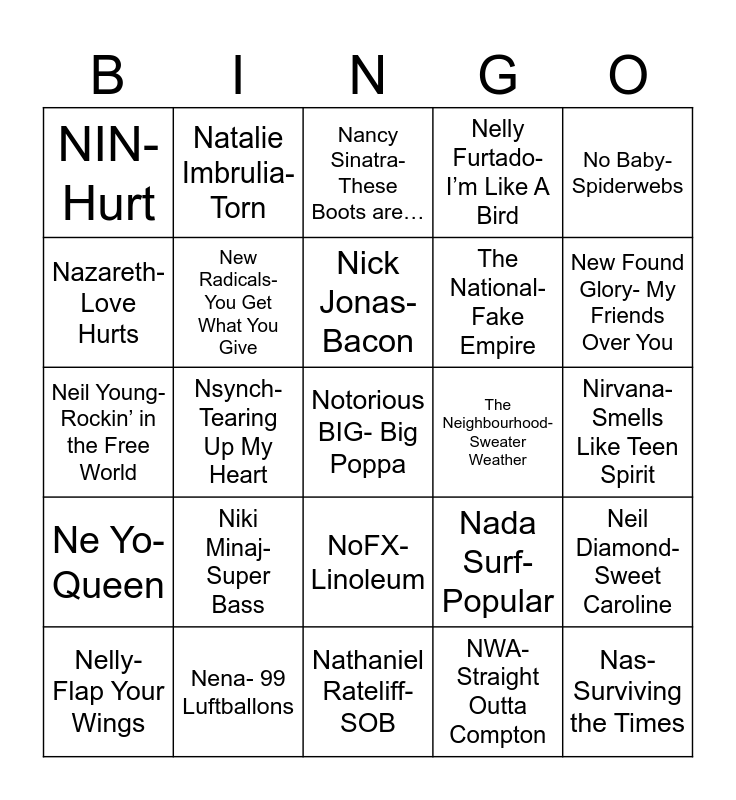 This bingo card has 27 words: Nada Surf- Popular, Nas- Surviving the Times, The National- Fake Empire, Nathaniel Rateliff- SOB, Nazareth- Love Hurts, Nancy Sinatra- These Boots are…, Natalie Imbrulia- Torn, Ne Yo- Queen, The Neighbourhood- Sweater Weather, Neil Diamond- Sweet Caroline, Neil Young- Rockin’ in the Free World, Nelly Furtado- I’m Like A Bird, Nelly- Flap Your Wings, Nena- 99 Luftballons, New Found Glory- My Friends Over You, New Order- Blue Monday, New Radicals- You Get What You Give, Nick Jonas- Bacon, Niki Minaj- Super Bass, NIN- Hurt, Nirvana- Smells Like Teen Spirit, NWA- Straight Outta Compton, Nsynch- Tearing Up My Heart, Notorious BIG- Big Poppa, NoFX- Linoleum, No Baby- Spiderwebs and NKOTB- Hangin’ Tough.