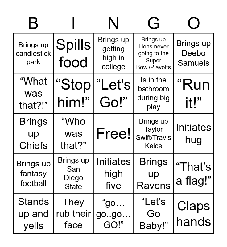 This bingo card has a free space and 24 words: Brings up San Diego State, They rub their face, “Let's Go!”, Stands up and yells, Brings up Deebo Samuels, Brings up candlestick park, “What was that?!”, Spills food, Brings up Taylor Swift/Travis Kelce, Initiates high five, Is in the bathroom during big play, Brings up Chiefs, Brings up Ravens, “That’s a flag!”, “Stop him!”, “Let’s Go Baby!”, Initiates hug, Brings up getting high in college, “Run it!”, “Who was that?”, Claps hands, Brings up fantasy football, Brings up Lions never going to the Super Bowl/Playoffs and “go…go..go…GO!”.