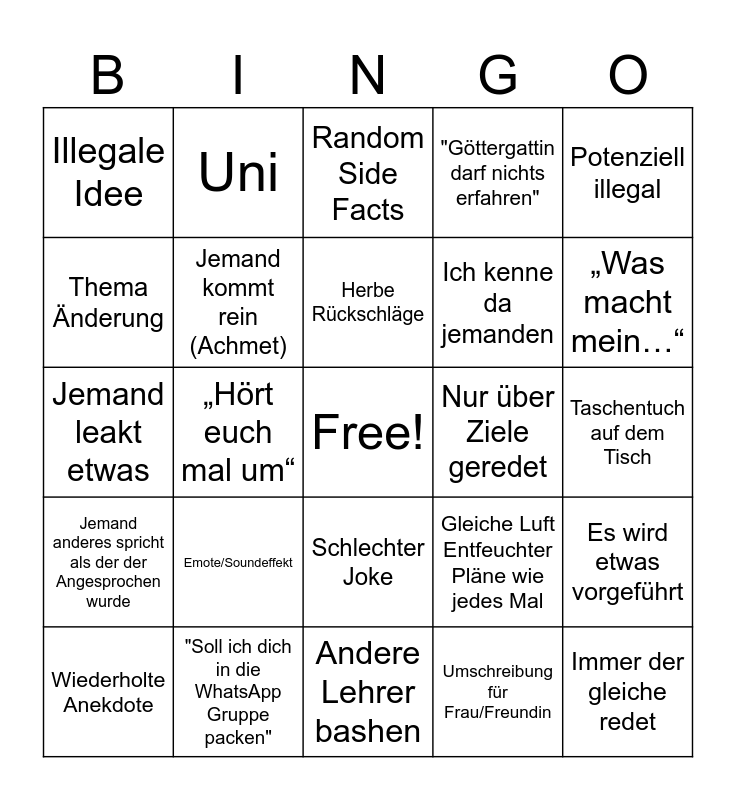 This bingo card has a free space and 25 words: Emote/Soundeffekt, Andere Lehrer bashen, Herbe Rückschläge, Wiederholte Anekdote, Potenziell illegal, Illegale Idee, Thema Änderung, Uni, Nur über Ziele geredet, Schlechter Joke, Ich kenne da jemanden, Jemand leakt etwas, Gleiche Luft Entfeuchter Pläne wie jedes Mal, Es wird etwas vorgeführt, Jemand kommt rein (Achmet), Letzte Reihe macht Buffet, Taschentuch auf dem Tisch, Random Side Facts, „Was macht mein…“, „Hört euch mal um“, Immer der gleiche redet, "Soll ich dich in die WhatsApp Gruppe packen", Jemand anderes spricht als der der Angesprochen wurde, "Göttergattin darf nichts erfahren" and Umschreibung für Frau/Freundin.