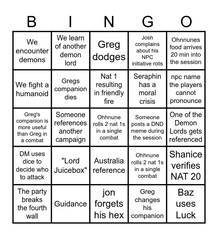 This bingo card has 25 words: DM uses dice to decide who to attack, Guidance, Ohhnune rolls 2 nat 1s in a single combat, Greg changes his companion, Ohnnunes food arrives 20 min into the session, We encounter demons, We learn of another demon lord, Greg dodges, Someone posts a DND meme during the session, Shanice verifies NAT 20, We fight a humanoid, Gregs companion dies, jon forgets his hex, Ohhnune rolls 2 nat 1s in a single combat, npc name the players cannot pronounce, The party breaks the fourth wall, Someone references another campaign, Nat 1 resulting in friendly fire, Seraphin has a moral crisis, One of the Demon Lords gets referenced, Greg's companion is more useful than Greg in a combat, "Lord Juicebox", Australia reference, Josh complains about his NPC initiative rolls and Baz uses Luck.